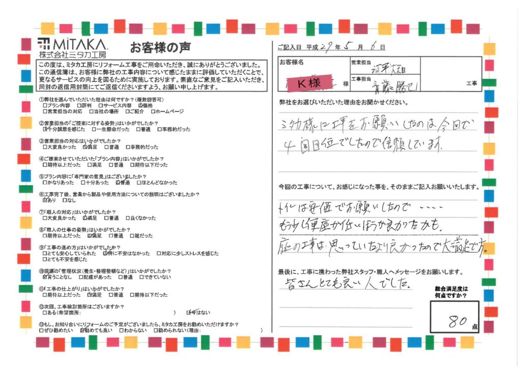 おかげ様で、あちこちとても快適です。大変お世話になりました。