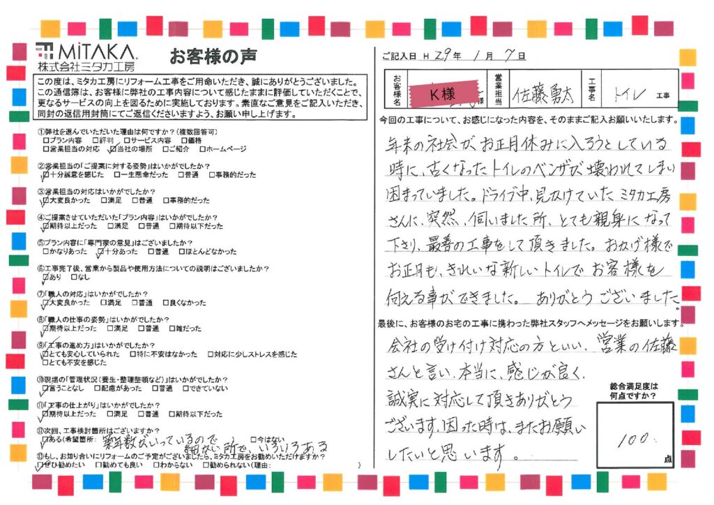 もっと早く工事をしてもらいたい位、満足しております。
