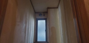 パテ処理をして、しっかりくっついていたクロスを剥がした凸凹等を埋めていきます。