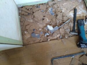 フローリングを剥がしたことで傷ついた下地も剥がしていきます(^ω^)