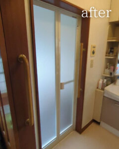 既存の古い折れ戸を撤去し、最新型の浴室折れ戸に交換。